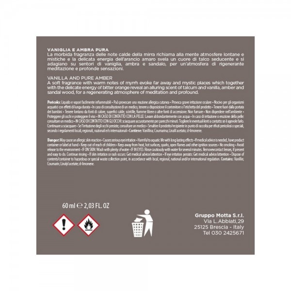 La morbida nota calda della mirra richiama alla mente atmosfere lontane e mistiche unita all'energia dell’arancio amaro, svelano un cuore di talco seducente e si adagiano su sentori di vaniglia, ambra e sandalo.