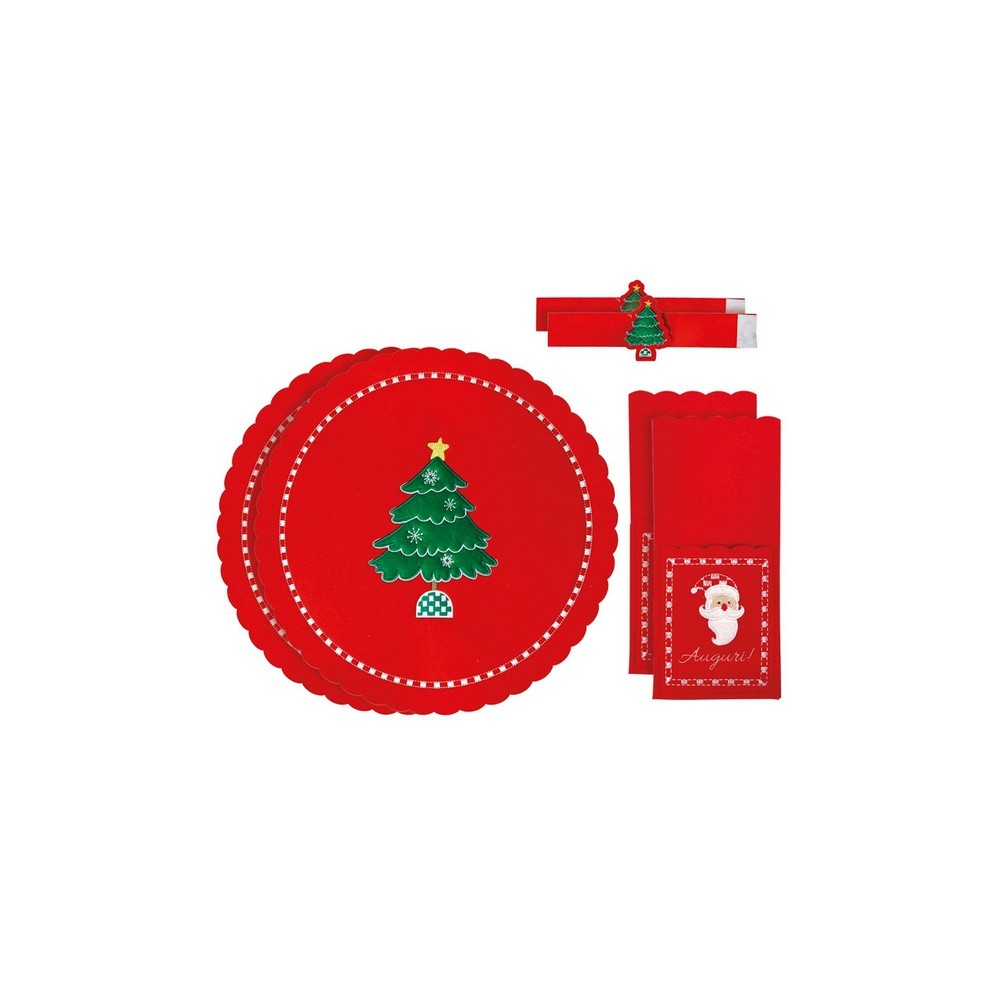 Realizzato in soffice feltro rosso, il posto tavola Brandani coniuga praticità e stile, due tovagliette, due portaposate e due portatovaglioliarricchiscono la tavola grazie a delicati ed eleganti decori natalizi.
