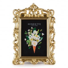 Elegante cornice Royal Champagne Henriette, di colore oro, con piede e sul retro gancio da appendere.Realizzata in resina di alta qualità fa parte della collezione Ostuni, che si distingue per il suo design elegante e raffinato.