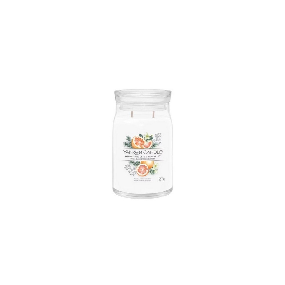 Candela grande Yankee Candle White Spruce & Grapefruit, è una fragranza agrumata.Note fresche e frizzanti ispirate al pompelmo e agli agrumi si combinano con esuberanti accenti che richiamano gli aghi di pino e il ricco abete, mentre tocchi al profumo di baccello di vaniglia e muschio regalano alla fragranza un’atmosfera accogliente.Questa è la più grande candela nella gamma realizzata con due stoppini e un mix di altissima qualità di cera di soia il quale fornisce una stupenda fragranza a lunga durata e una meravigliosa atmosfera.