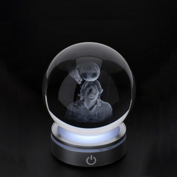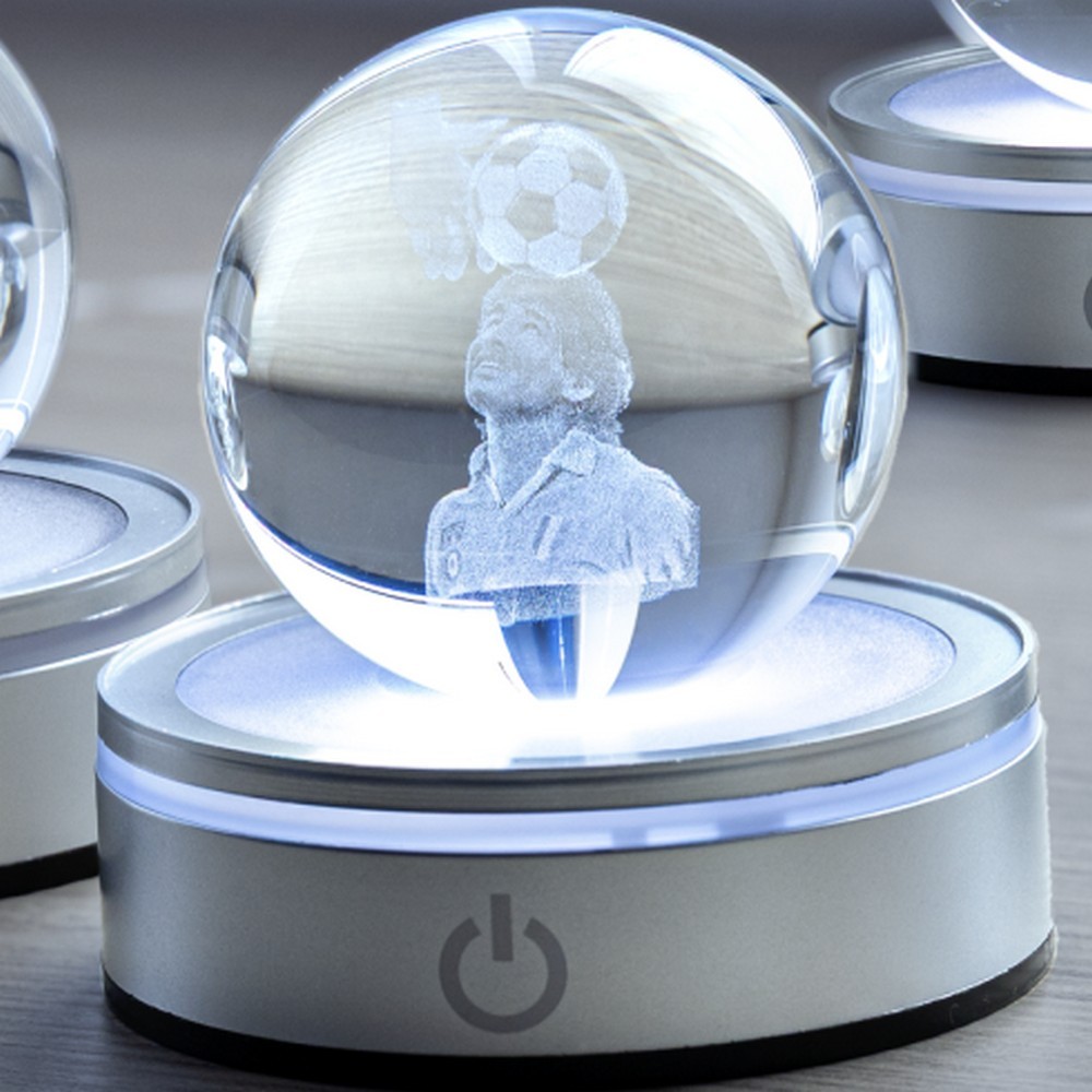 Sfera di Cristallo Hervit con disegno in 3D di Maradona inciso a laser e base argento luminosa RGB con differenti funzioni e colori luci.