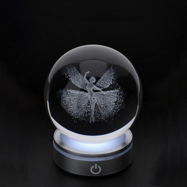 Sfera di Cristallo di Hervit con disegno in 3D di una ballerina Fatata inciso a laser e base argento luminosa RGB con differenti funzioni e colori luci.