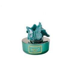 La deliziosa Candela con farfalle in ceramica di Capodimonte di colore verde in vasetto tondo di vetro effetto lucido è perfetta per profumare e creare atmosfere magiche.