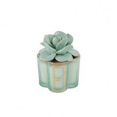 La deliziosa Candela con rosa in ceramica di colore verde salvia in vasetto quadrifoglio di vetro effetto lucido è perfetta per profumare e creare atmosfere magiche.