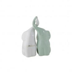Elefanti piccoli intrecciati in porcellana, di colore bianco e verde salvia entrambi lucidi.Gli elefanti sono universalmente riconosciuti come simboli di buona fortuna, saggezza, forza e affetto familiare. La versione intrecciata enfatizza ulteriormente i concetti di coppia, amore e protezione reciproca.