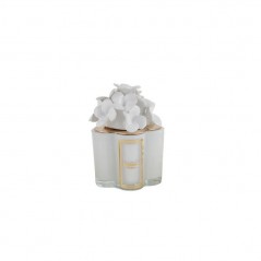 La deliziosa Candela con ortensie in ceramica di colore bianco in vasetto quadrifolio di vetro effetto lucido è perfetta per profumare e creare atmosfere magiche.