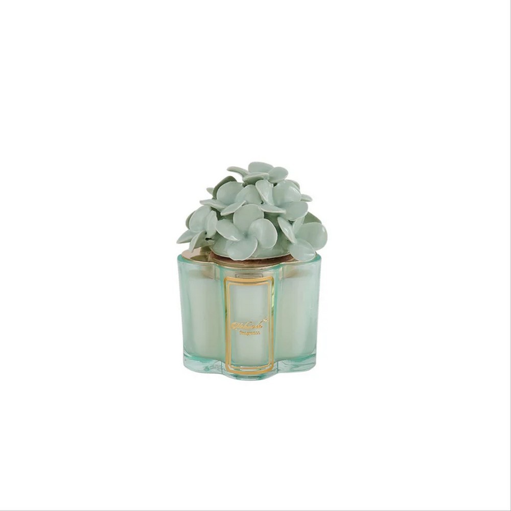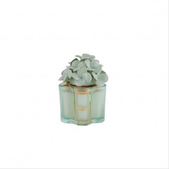 La deliziosa Candela con ortensie in ceramica di colore verde salvia in vasetto quadrifolio di vetro effetto lucido è perfetta per profumare e creare atmosfere magiche.