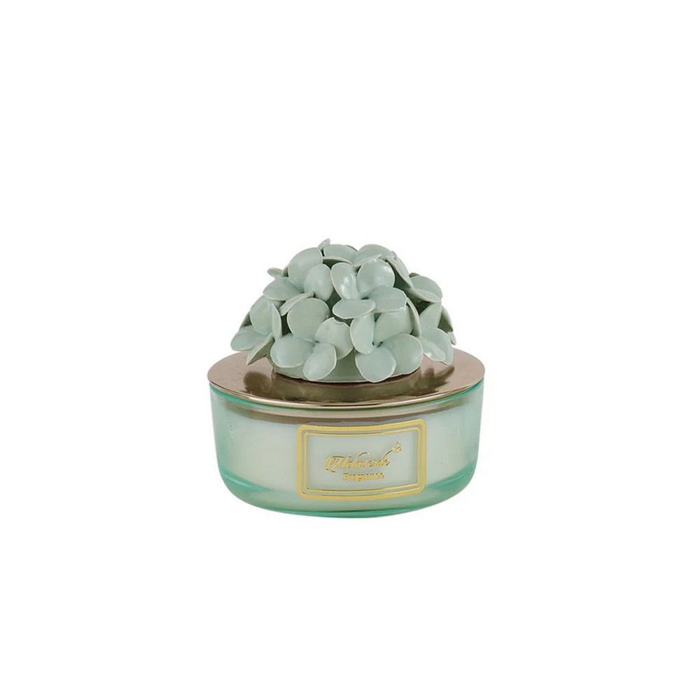 La deliziosa Candela con ortensie in ceramica di Capodimonte di colore verde salvia in vasetto tondo di vetro effetto lucido è perfetta per profumare e creare atmosfere magiche.
