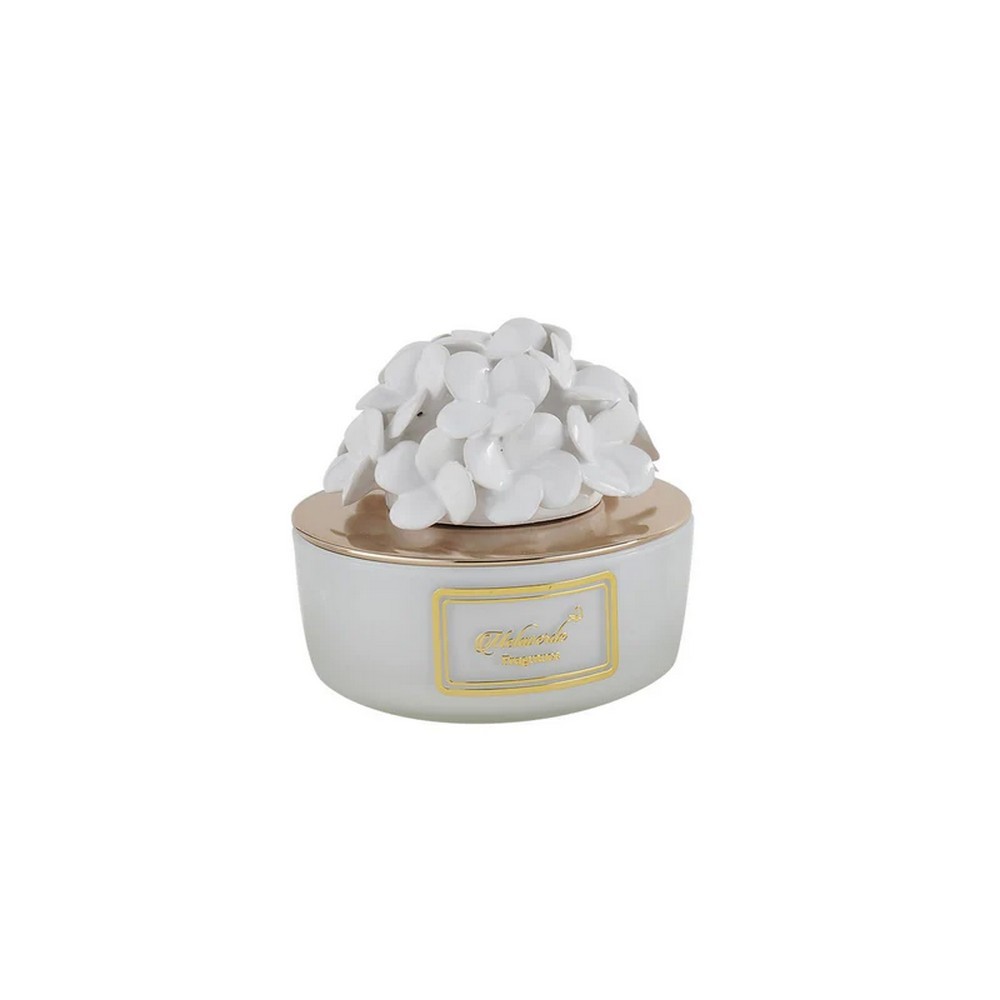 La deliziosa Candela con ortensie in ceramica di Capodimonte di colore bianco in vasetto tondo di vetro effetto lucido è perfetta per profumare e creare atmosfere magiche.