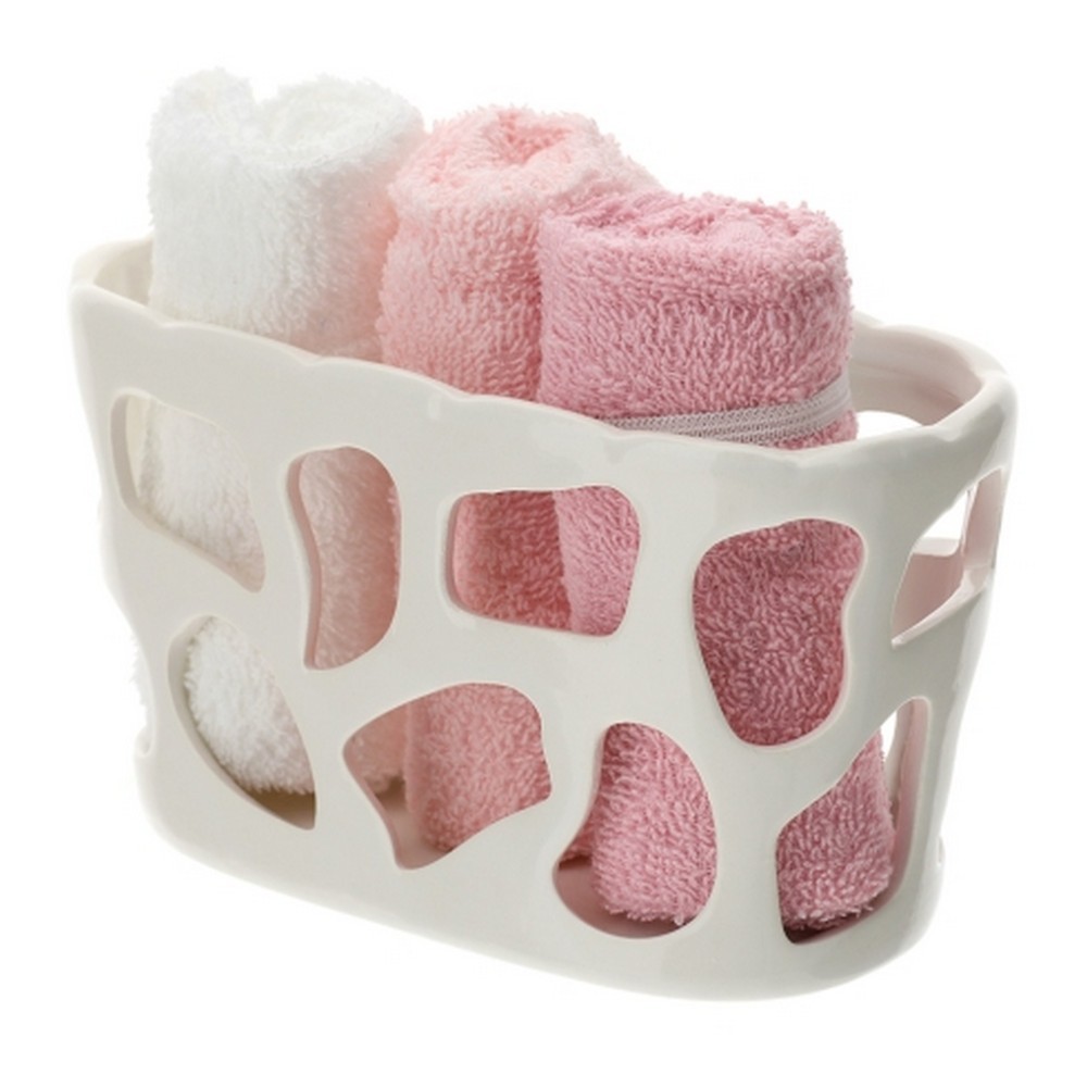 Set contenitore Hervit composto da una base in porcellana bianca traforata a mano con traforo a mucca e 3 Lavette in 100%cotone in 3 tonalità: Bianca, Rosa pastello e Rosa Antico.