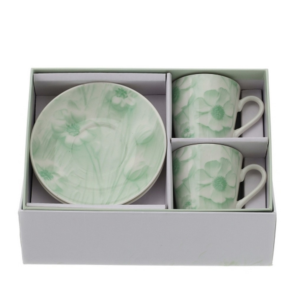 Un set elegante e allegro, perfetto per rendere speciale la pausa caffè. Questo box da 2 tazzine da caffè con piattino, decorate con raffinati fiori verdi della linea Canvas è la nuova proposta di Hervit.