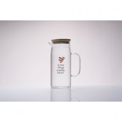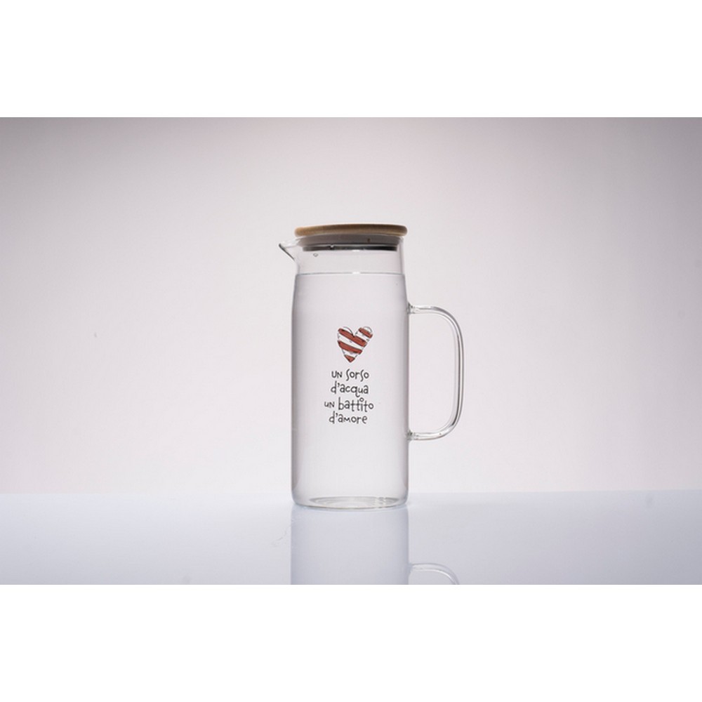 Caraffa in vetro borosilicato trasparente, decorata con delicati cuoricini e scritta “Un sorso d’acqua, un battito d’amore”, appartenente alla linea Amici di Cuorematto. Un oggetto elegante e funzionale. Il vetro borosilicato garantisce leggerezza, resistenza e una resa estetica raffinata, rendendo la caraffa adatta sia all’uso quotidiano sia come elemento decorativo per la tavola. Il coperchio in bambù completa il design con un tocco naturale ed essenziale.