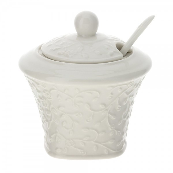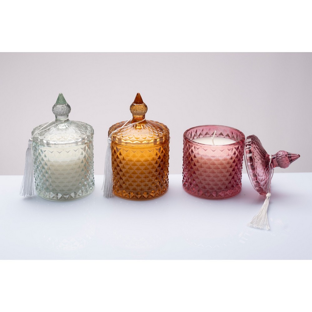 Il contenitore in vetro lavorato effetto diamante, completo di coperchio e nappina decorativa, dona un tocco sofisticato e luminoso.