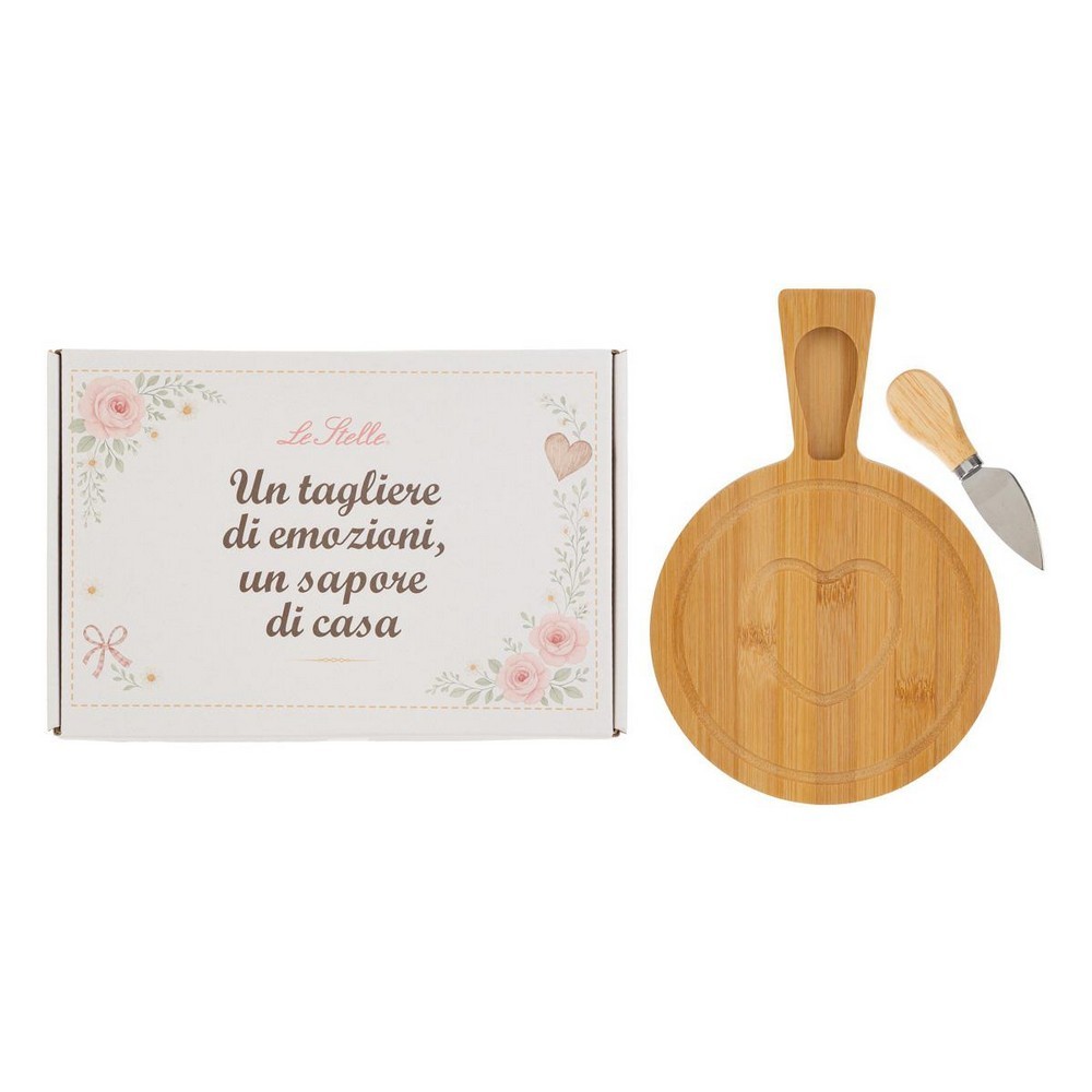 Set composto da tagliere in legno e coltello formaggo in metallo, perfetto per servire con stile pizze e focacce. Un’idea utile e originale, ideale come bomboniera o regalo per chi ama la convivialità a tavola. Confezionata in un packaging coordinato di grande effetto, rappresenta una scelta sofisticata per chi desidera stupire con semplicità e gusto.