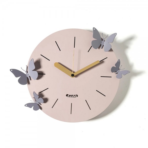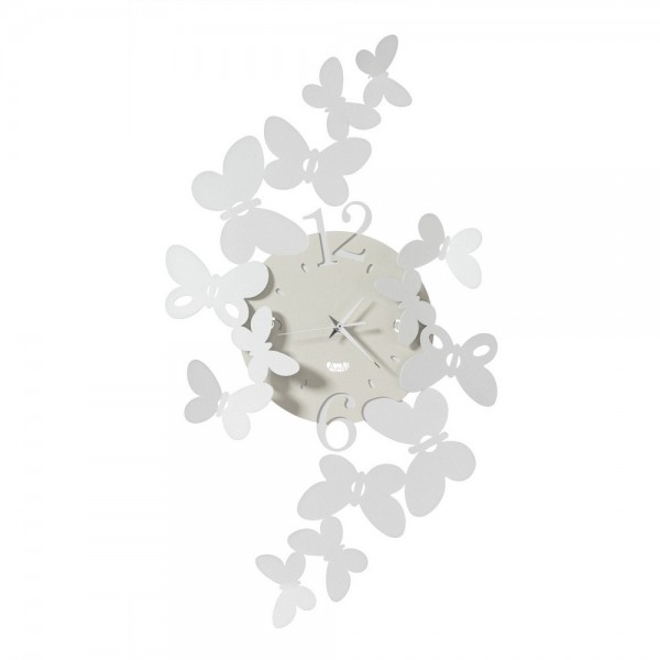 L'Orologio da parete presenta una forma circolare con una base decorata con numeri, fiori e farfalle intagliate. Le tre farfalle con ali piegate, fissate sulla base, conferiscono un aspetto tridimensionale all'orologio, aggiungendo un tocco di fascino e movimento al suo design.