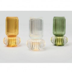 Luce d’atmosfera e design in un’unica bomboniera. Il vaso lampada LED ambra di AD in vetro unisce la trasparenza delle righe verticali a una base luminosa che diffonde una luce calda e soffusa, perfetta per impreziosire tavola, living o comodino. La forma bicolonna con corpo superiore per fiore singolo o mini bouquet e sfera scanalata inferiore illuminata crea un effetto scenografico ricercato.