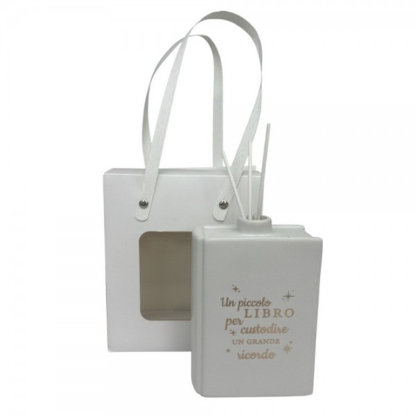 Il Libro Profumatore bianco con scritta della collezione Ad Emozioni è una bomboniera elegante e significativa, pensata per accompagnare con stile i momenti più importanti della vita, come battesimo, prima comunione e cresima. Realizzato in ceramica smaltata di qualità, presenta tre scritte assortite che rendono ogni pezzo unico. Incluso di bastoncini e scatola