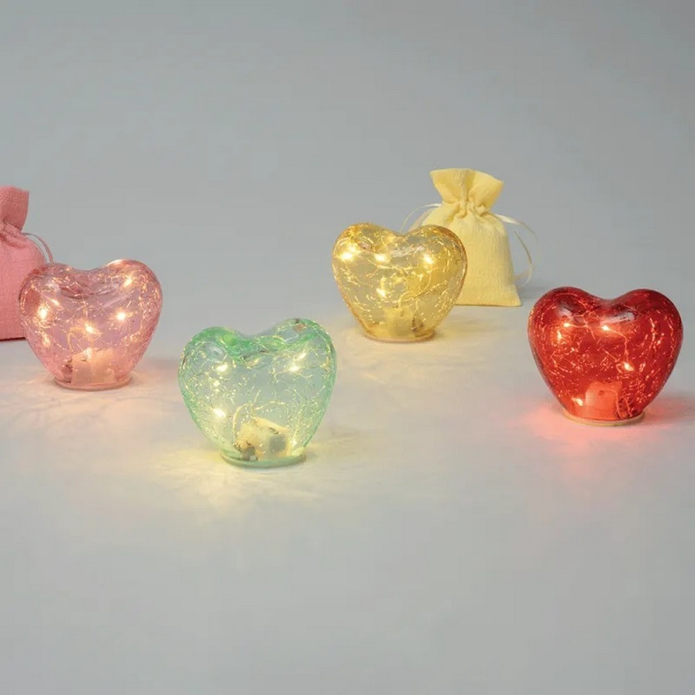 Il cuore in vetro con micro LED Craquelé di AD a luce calda di colore giallo crea un incantevole effetto “crack” (crackle) che riflette la luce in mille frammenti. Illumina il tuo giorno speciale con una bomboniera romantica e scenografica.