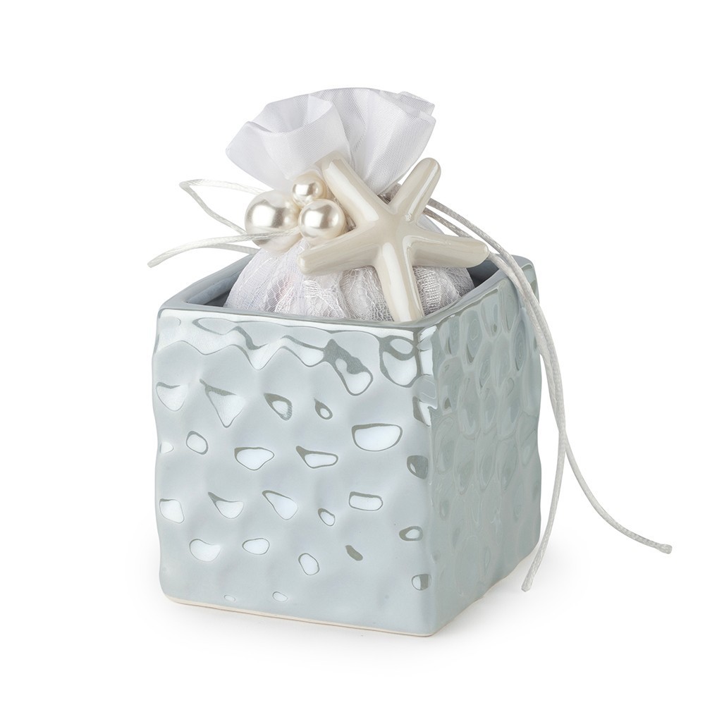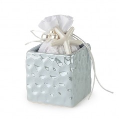 Scatola cubo Hervit in porcellana perlata azzurra, con sapone da bagno profumo vaniglia e decoro stella sempre in porcellana bianca perlata.