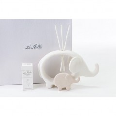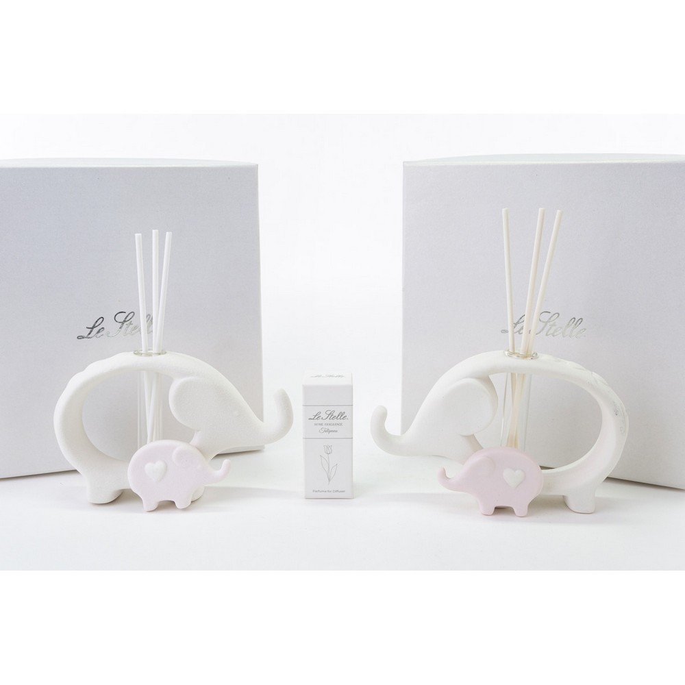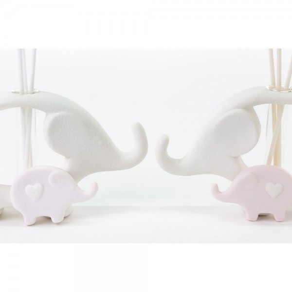 Profumatore elefante stilizzato in porcellana satinata con accanto un piccolo elefantino rosa con al centro un cuoricino, in due posizioni assortite incluso di astuccio,profumino e bastoncini.Il prezzo equivale al singolo articolo,in caso di preferenza o una quantità superiore contattare il servizio clienti.