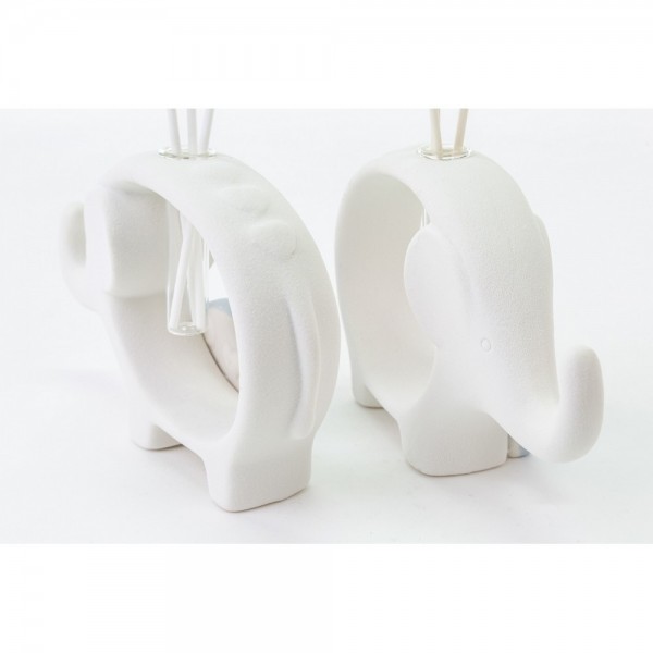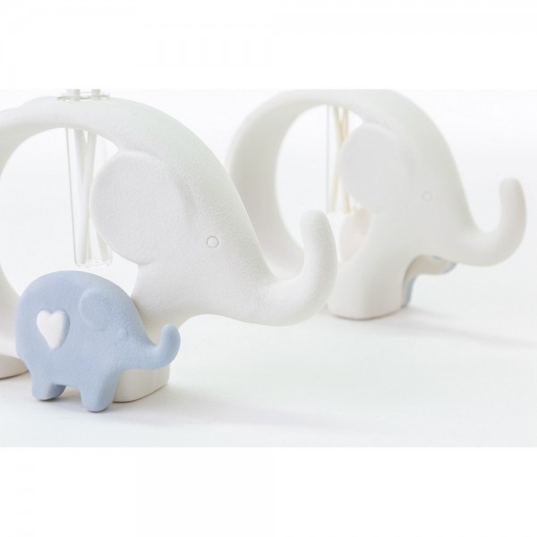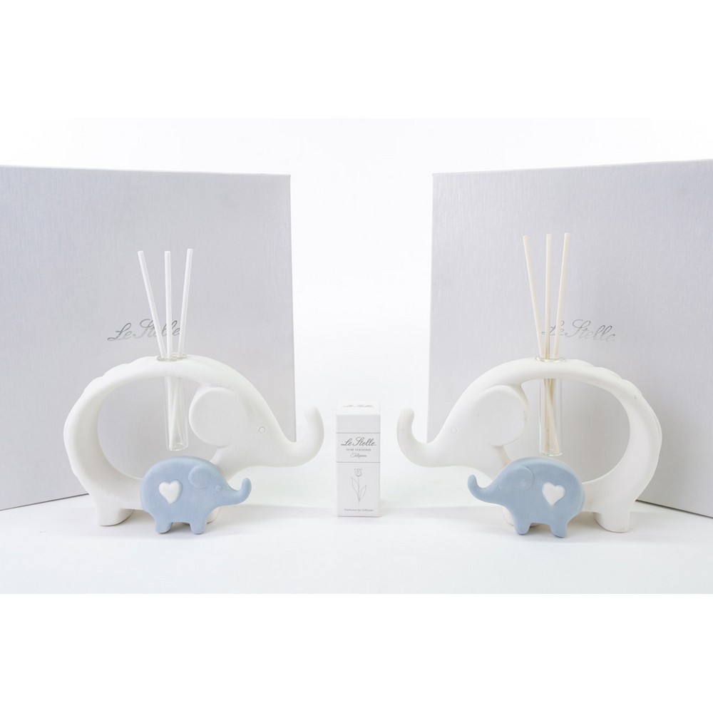 Profumatore elefante stilizzato in porcellana satinata con accanto un piccolo elefantino celeste con al centro un cuoricino, in due posizioni assortite incluso di astuccio,profumino e bastoncini.Il prezzo equivale al singolo articolo,in caso di preferenza o una quantità superiore contattare il servizio clienti.