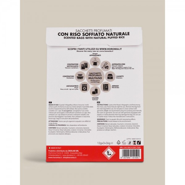 Creati con riso soffiato naturale non alimentare, i sacchetti profumati Horomia sono formulati per donare ai tuoi capi e alla tua casa il profumo unico e inconfondibile della tua fragranza preferita. Ogni confezione contiene tre sacchetti profumati avvolti in una busta trasparente ad alta protezione, per un profumo intenso e duraturo fino a 12 settimane.