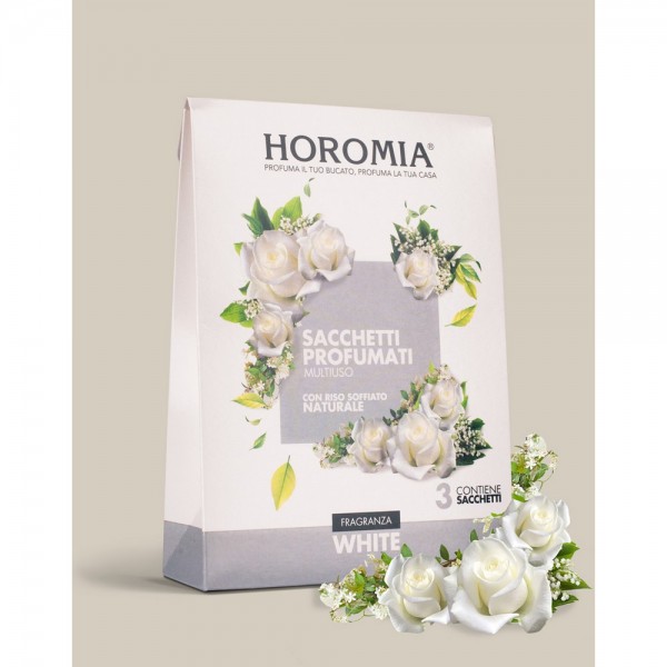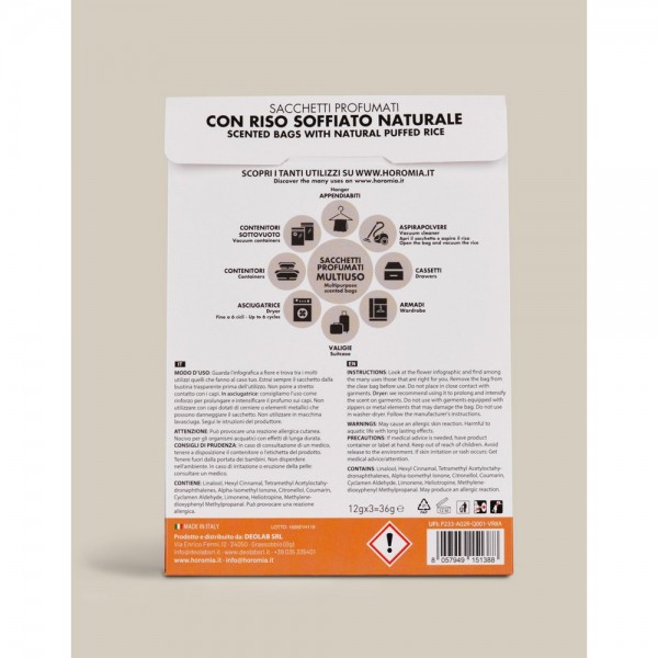 Creati con riso soffiato naturale non alimentare, i sacchetti profumati Horomia sono formulati per donare ai tuoi capi e alla tua casa il profumo unico e inconfondibile della tua fragranza preferita. Ogni confezione contiene tre sacchetti profumati avvolti in una busta trasparente ad alta protezione, per un profumo intenso e duraturo fino a 12 settimane.