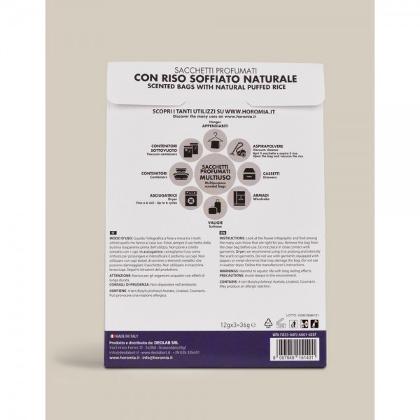 Creati con riso soffiato naturale non alimentare, i sacchetti profumati Horomia sono formulati per donare ai tuoi capi e alla tua casa il profumo unico e inconfondibile della tua fragranza preferita. Ogni confezione contiene tre sacchetti profumati avvolti in una busta trasparente ad alta protezione, per un profumo intenso e duraturo fino a 12 settimane.