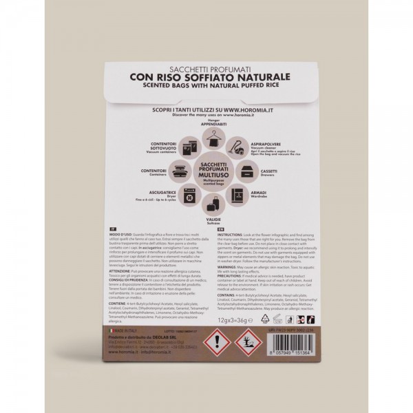 Creati con riso soffiato naturale non alimentare, i sacchetti profumati Horomia sono formulati per donare ai tuoi capi e alla tua casa il profumo unico e inconfondibile della tua fragranza preferita. Ogni confezione contiene tre sacchetti profumati avvolti in una busta trasparente ad alta protezione, per un profumo intenso e duraturo fino a 12 settimane.