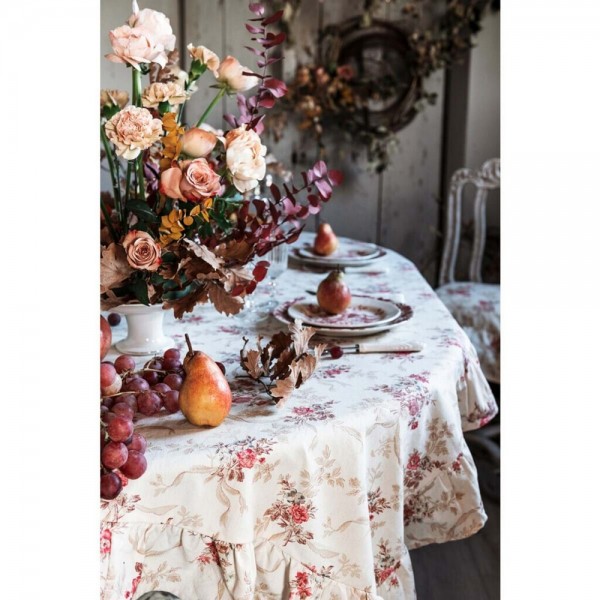 Deliziosa tovaglia Primo Bacio di Blanc Mariclò perfetta da utilizzare anche come romantico copritavolo, arricchito da una bella balza su tutti e quattro i lati.
