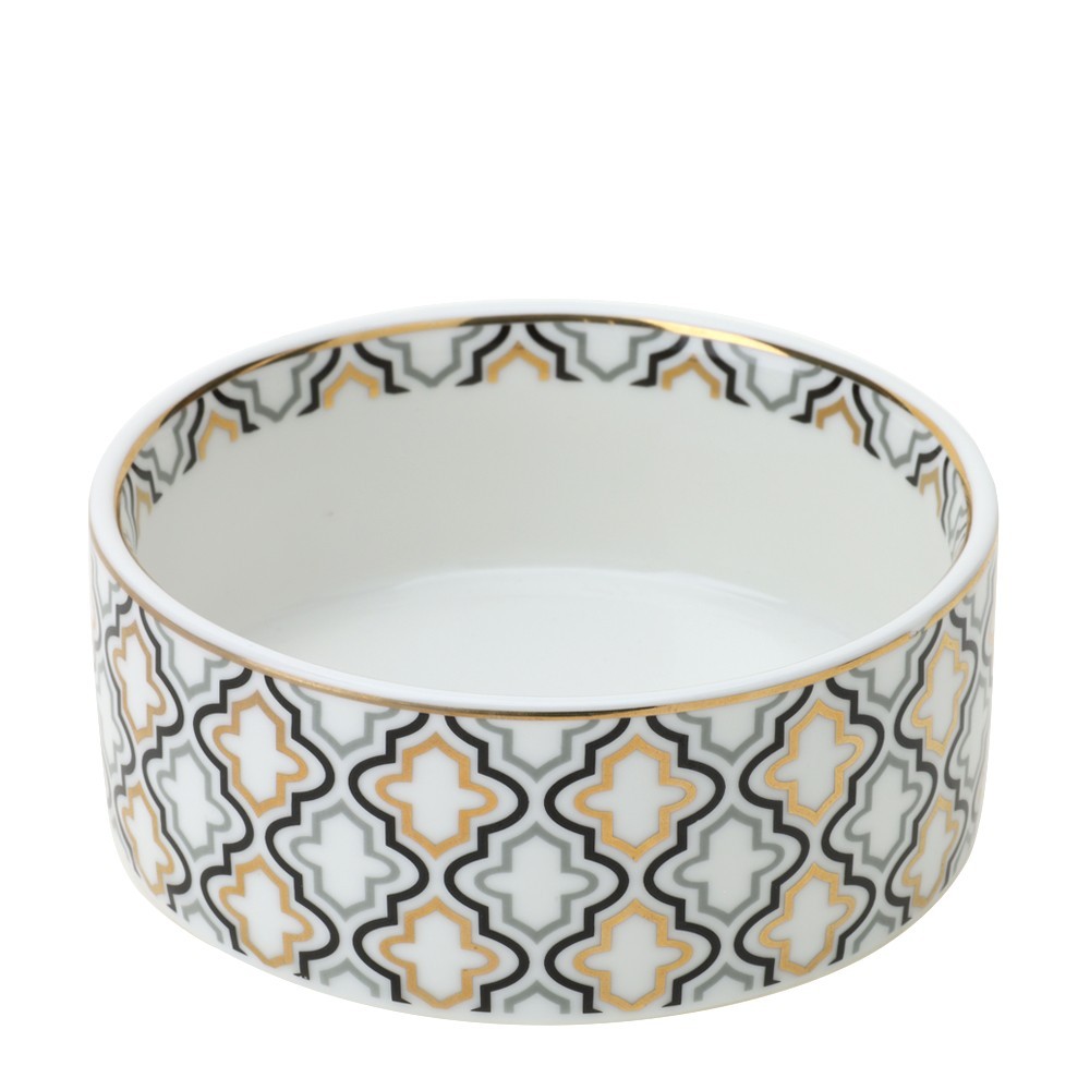 Ciotola Hervit della collezione Marrakech VLK Design motivi geometrici in bianco e nero si intrecciano con l'oro zecchino su pregiata porcellana new bone china.Novità e tradizione in una linea dinamica e sofisticata.