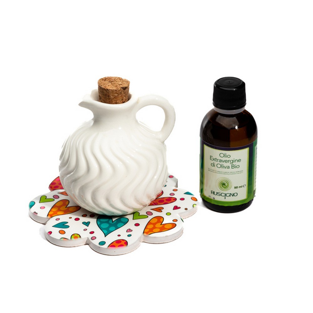 Oliera con piattino e olio evo incluso in ceramica di Cuorematto della nuova collezione Cuoricini, una linea gioiosa, colorata per i cuori innamorati.