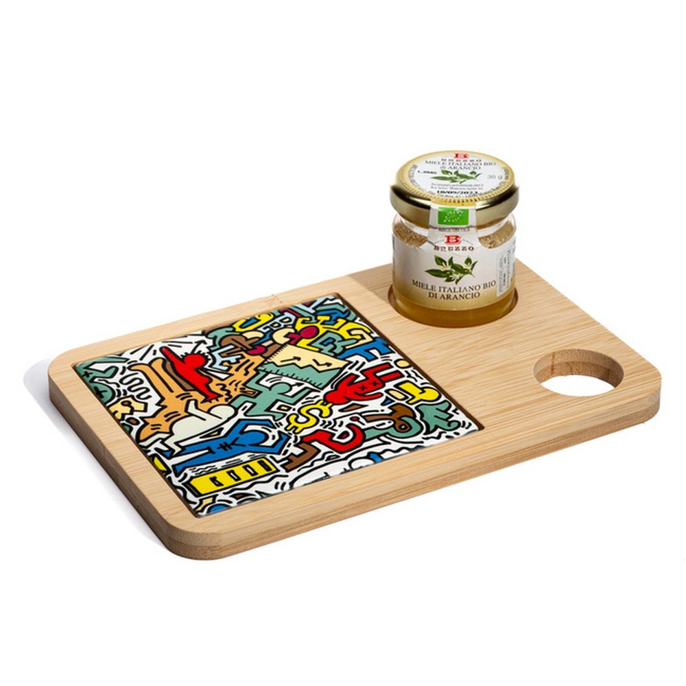 Tagliere in legno con mattonella in ceramica di Amici di Cuorematto della linea graffiti,inclusa di coltellino formaggi e miele.