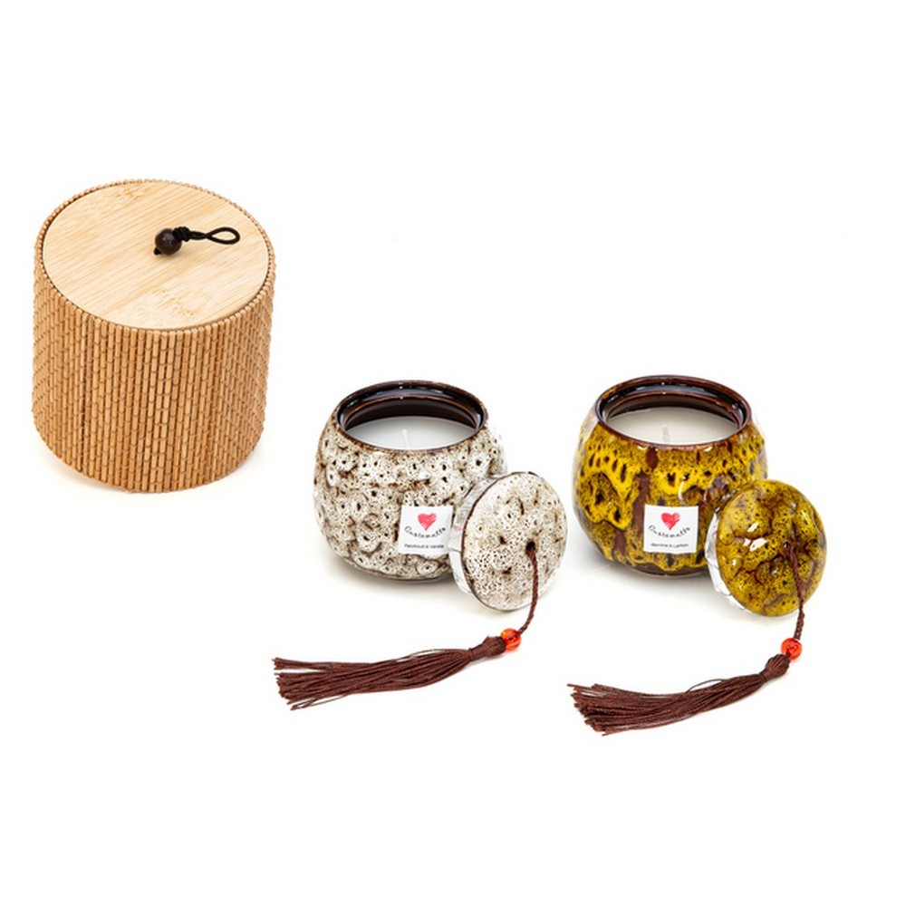 Candela media assortita in due colori con astuccio in bambù di Cuorematto della nuova collezione Ceramica Raku, sinonimo di rilassatezza e gioia di vivere.In caso di preferenza specificare l'articolo, il prezzo equivale al singolo articolo.