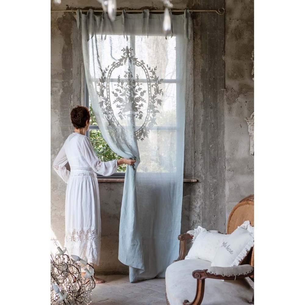 Preziosa e ricercata, la tenda in lino con grande ricamo centrale della Collezione Dentelle Blanc MariClo'. La tenda, caratterizzata dalla presenza di laccetti tramite i quali fissarla al bastone reggitenda, è realizzata in morbido tessuto di lino.