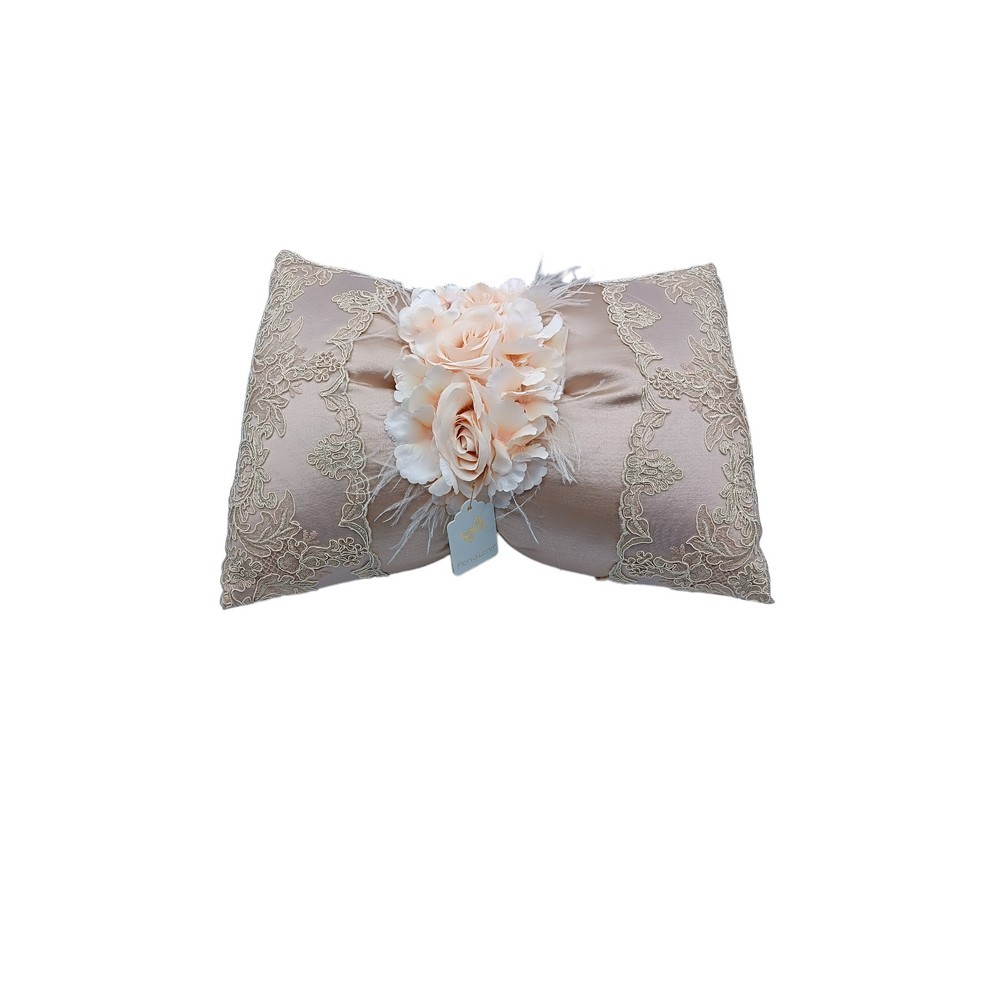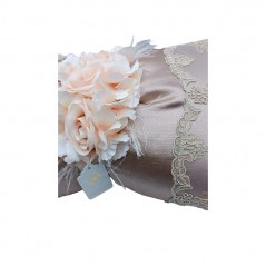 Cuscino Fiocco Seta Rosa Antico con Pizzo e Rose Fiori Di Lena