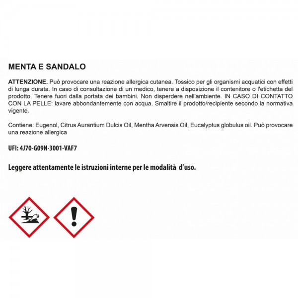 MENTA E SANDALO Essenza che diffonde nell’ambiente una sensazione di aria fresca e pulita. Note di menta, lavanda, mela verde, basilico e legni donano un tocco di energia e vitalità..