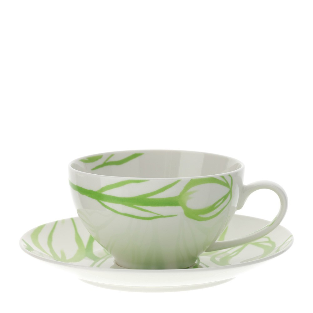 Tazza Colazione con piattino in porcellana bianca dal decoro di tulipani dipinti di verde.Porta in tavola la primavera con le nuove tazze da colazione della linea TULIP.