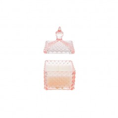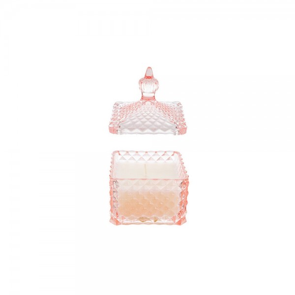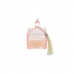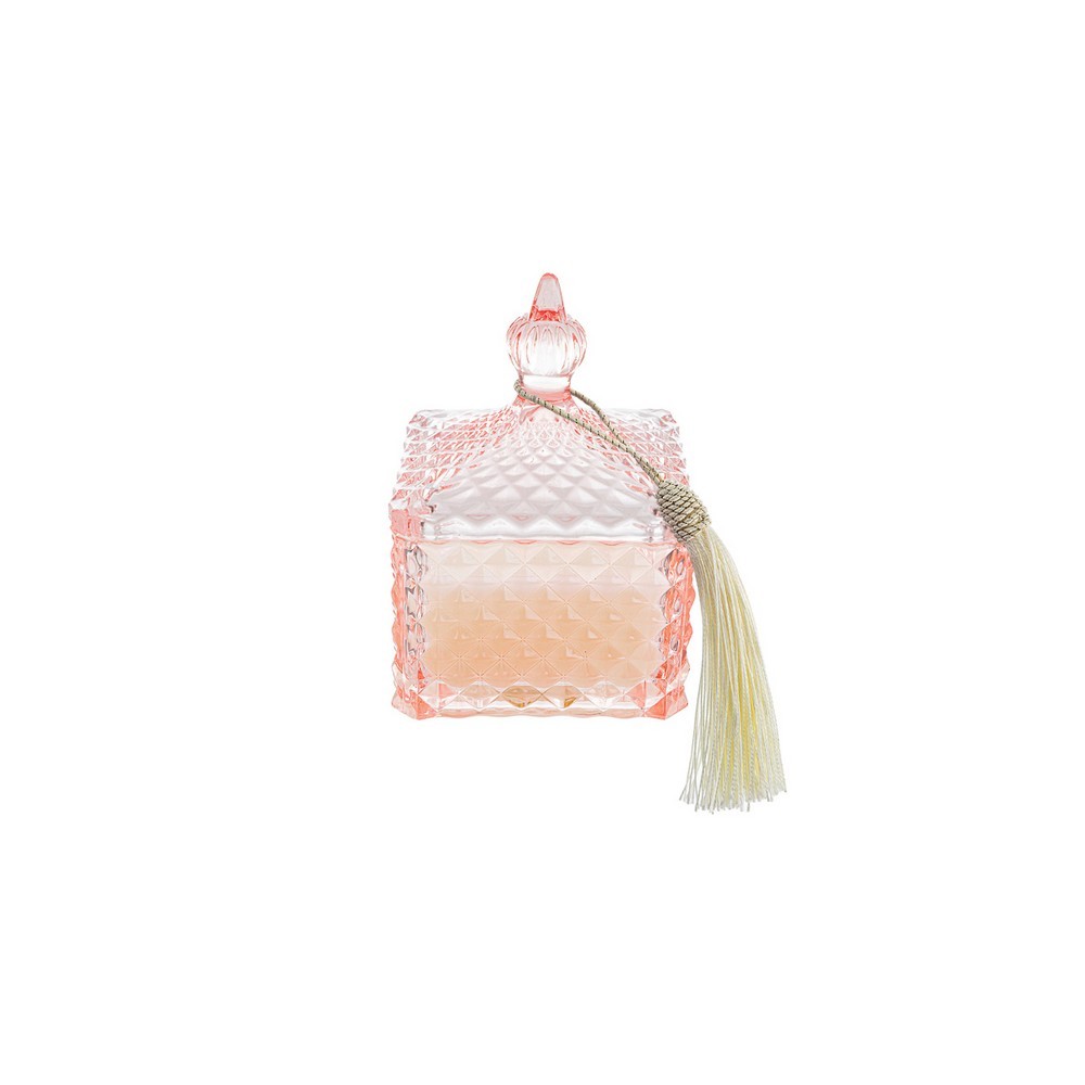 Contenitore con coperchio candela profumata in vetro di colore rosa con nappina.Incluso di shopper.