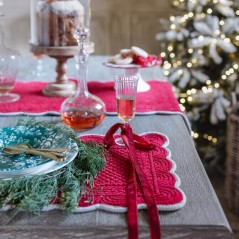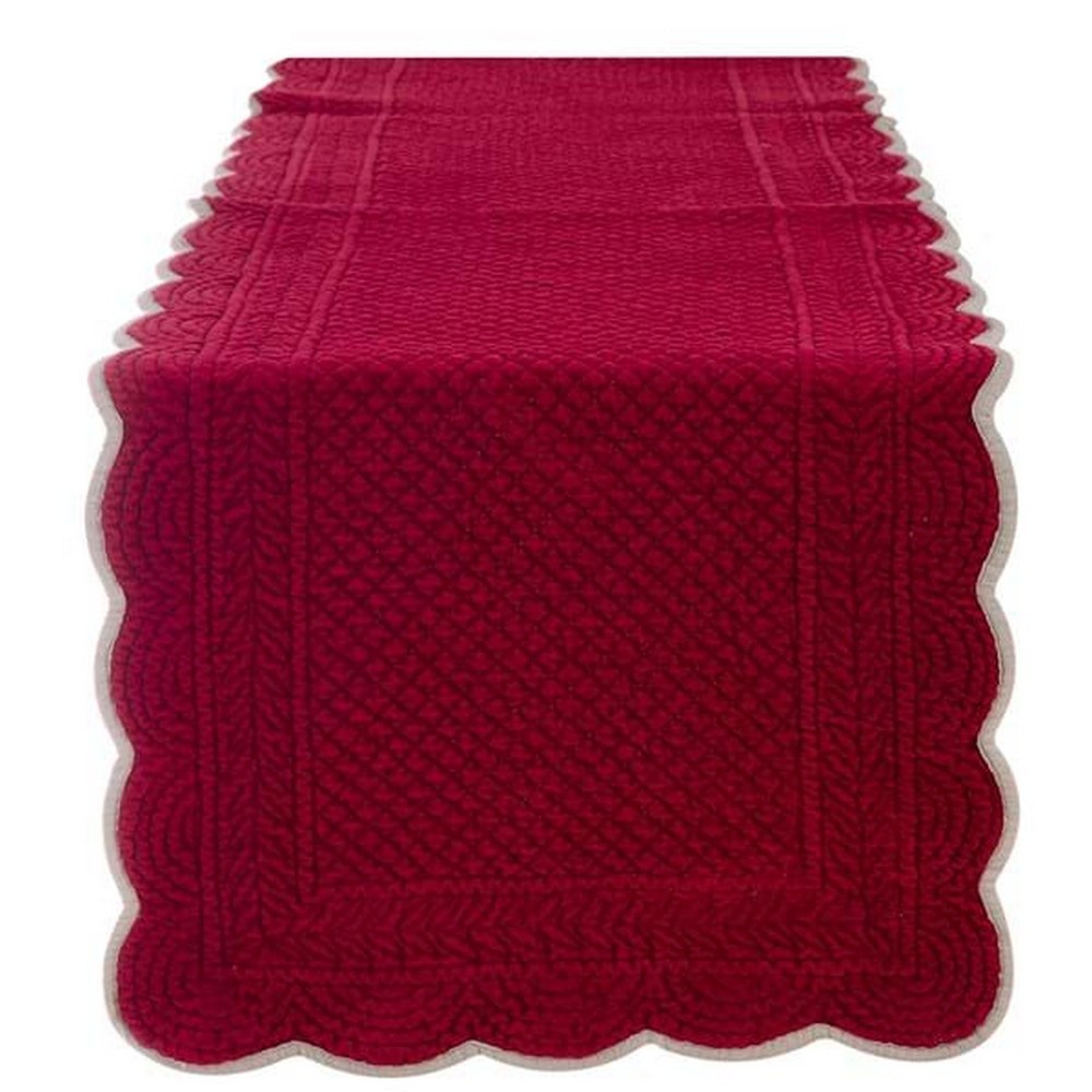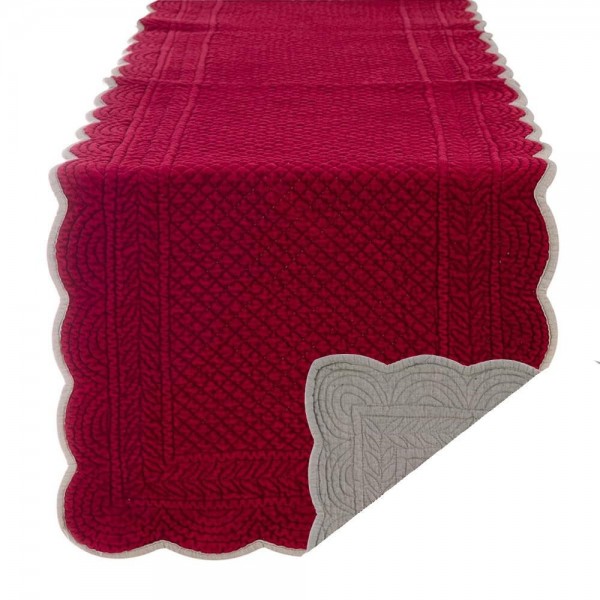 Elegante striscia centrotavola bicolore di Blanc Mariclò dalla raffinata lavorazione, in prezioso velluto di cotone arricchita da una bella e importante trapuntatura e da un delizioso bordo a smerlo.La parte sottostante è in cotone colore lino, la parte superiore in velluto rosso.