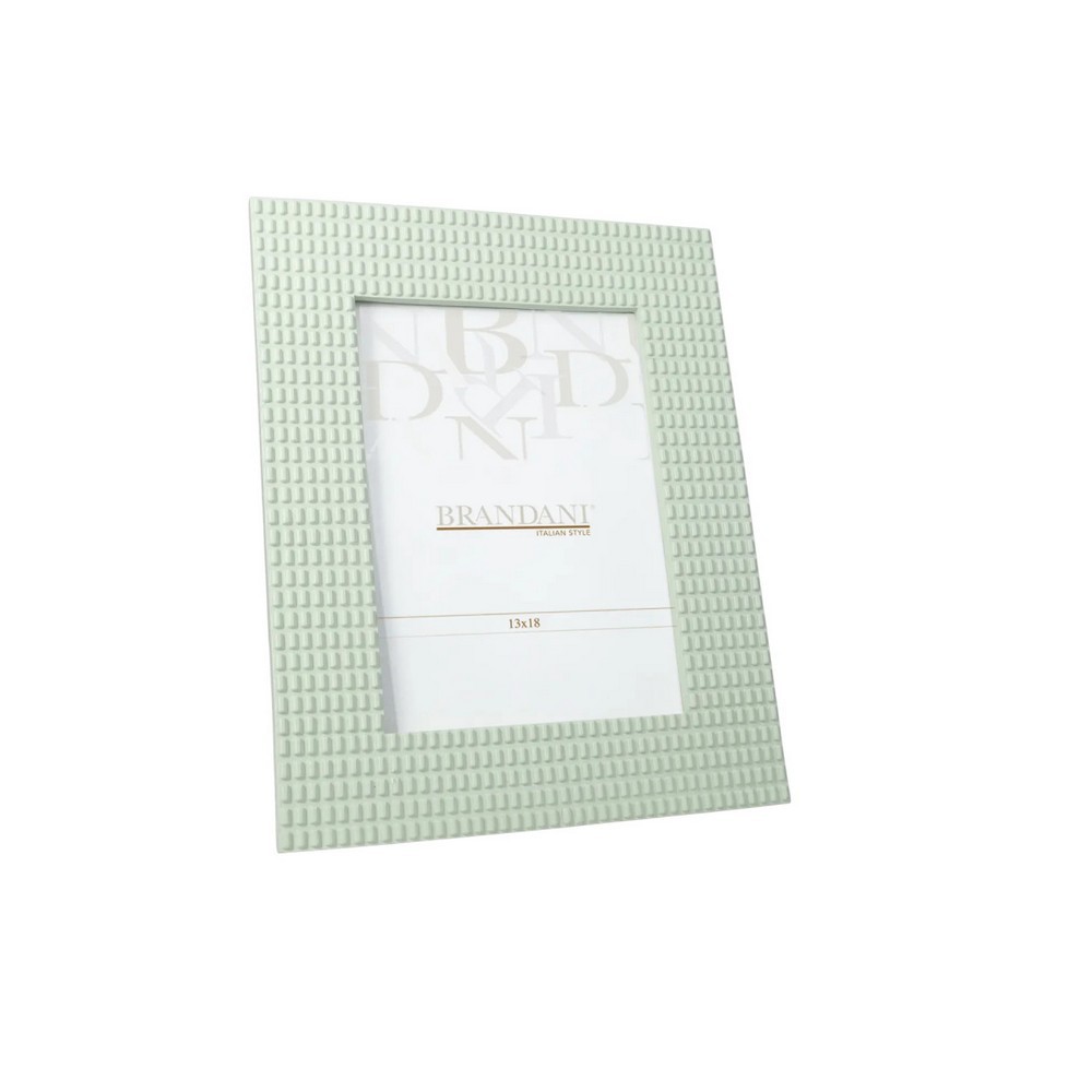 Portafoto lingotto Brandani prende il nome dal suo peculiare decoro: perfetto per potenziare le foto contenute, grazie alla sua forma rettangolare con pratico piedistallo potrà essere poggiato sia in posizione verticale che in orizzontale.Realizzato in poliresina di colore verde acqua.