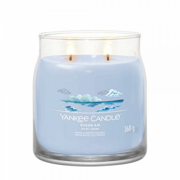 Candela media Yankee Candle Ocean Air, è una fragranza Fresca e pulita.Stendete il vostro telo da spiaggia nella fresca brezza dell'oceano dopo una divertente giornata al sole. Note che evocano l'ozono pulito si mescolano con profumi ispirati al gelsomino, all'ambra bianca e al legno di sandalo.La candela a giara media a due stoppini e un mix di altissima qualità di cera di soia il quale fornisce una stupenda fragranza a lunga durata e una meravigliosa atmosfera.
