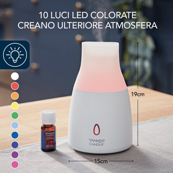 Bastano cinque o sette gocce delle nuove fragranze per Diffusore ad ultrasuoni Yankee Candle® per ottenere fino a 8 ore* di nebulizzazione profumata. Per creare ulteriore atmosfera, il diffusore si illumina con luci di 10 colori diversi. Potete decidere di lasciare che i colori si alternino, oppure selezionare il colore che preferite per creare l'atmosfera perfetta. La funzione di spegnimento automatico permette di rilassarsi senza preoccupazioni.