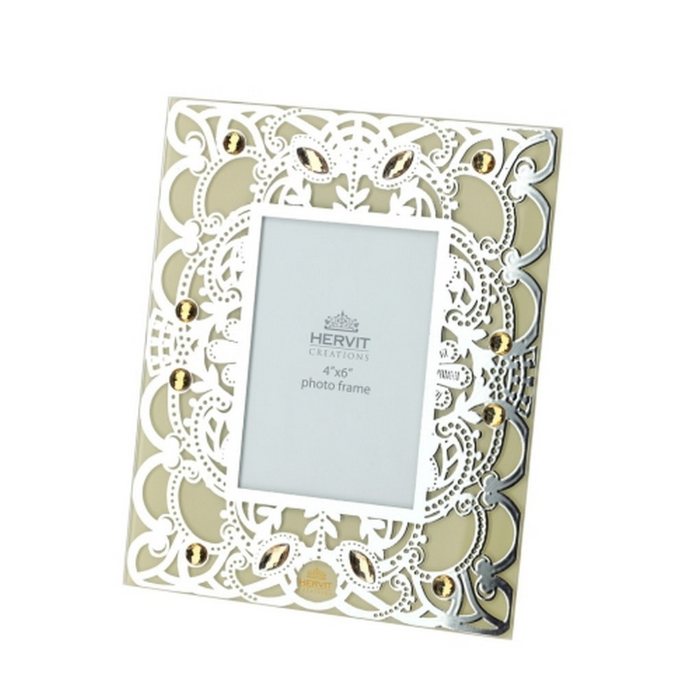 Questa raffinata cornice Byzantium della linea Hervit presenta un fondo giallo delicato, arricchito da dettagli argento che creano un elegante contrasto, donando luminosità e raffinatezza al design. Gli intagli decorativi e le pietre brillanti completano l’aspetto sofisticato, rendendola un pezzo unico e di grande valore estetico.