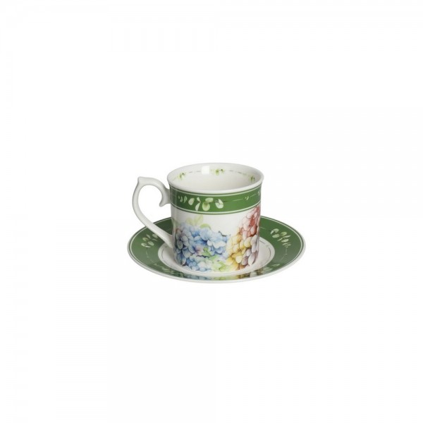 Una collezione ispirata alla natura rigogliosa, che unita al verde intenso tipico dei giardini più floridi regala ai tuoi spazi una calda ed elegante atmosfera. Raffinate ortensie e delicati ornamenti floreali adornano il set di tazzine e piattino in porcellana.