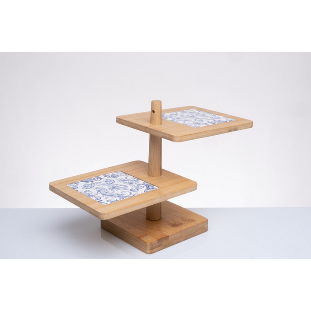 Elegante alzata a 2 piani, con struttura in legno e basi in ceramica decorate con un raffinato fregio. Perfetta per presentare dolci, pasticcini o piccoli regalini, questa alzata unisce funzionalità e stile in un design sofisticato.