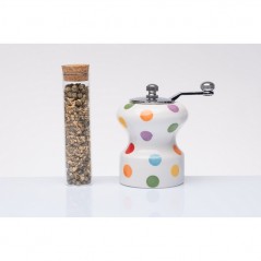 Macinapepe in porcellana di Gli amici di Cuorematto dipinto a mano e completo di fialetta con pepe gourmet, è ideale per aggiungere un tocco di eleganza artigianale a qualsiasi cucina. Realizzato con materiali di alta qualità, il macinapepe dipinto non solo si distingue per il suo design artistico, ma anche per la sua praticità nell’uso quotidiano. Dimensione: h9 cm Ottima idea regalo e bomboniera