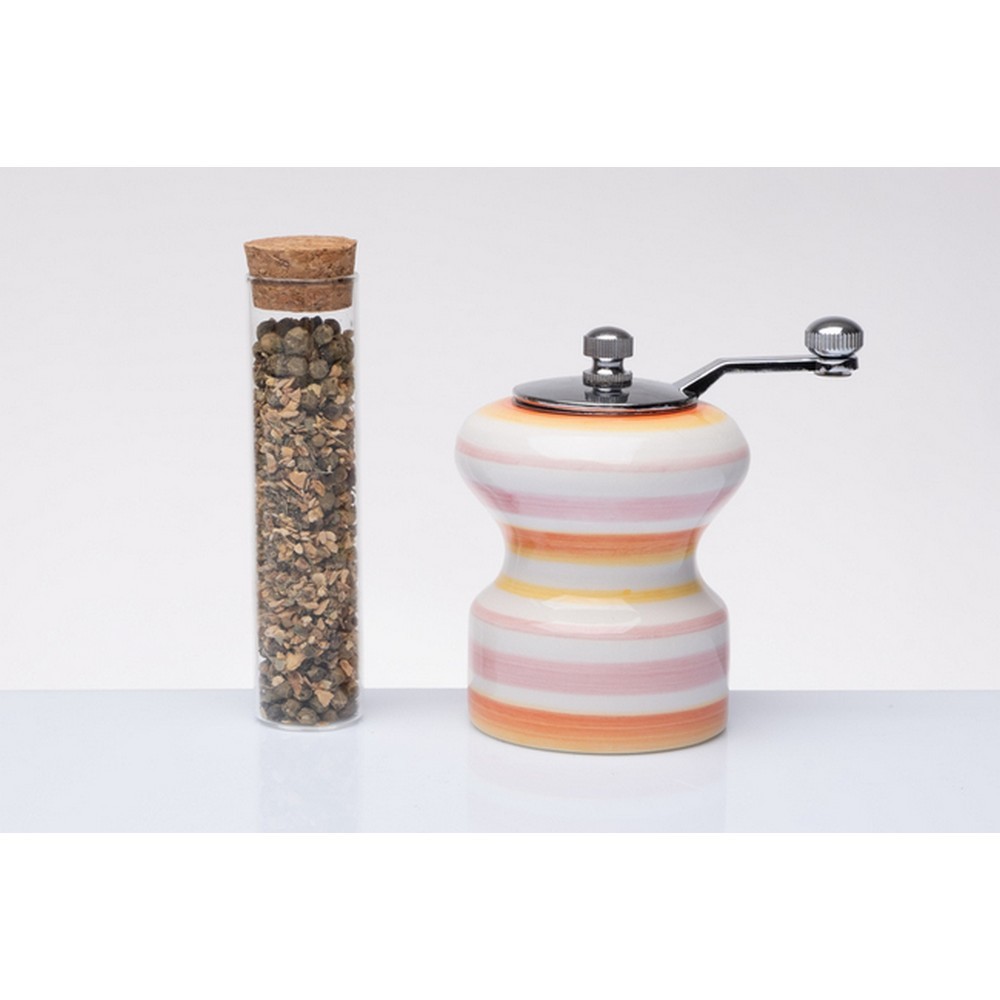 Macinapepe in porcellana di Gli amici di Cuorematto dipinto a mano e completo di fialetta con pepe gourmet, è ideale per aggiungere un tocco di eleganza artigianale a qualsiasi cucina. Realizzato con materiali di alta qualità, il macinapepe dipinto non solo si distingue per il suo design artistico, ma anche per la sua praticità nell’uso quotidiano. Dimensione: h9 cm Ottima idea regalo e bomboniera