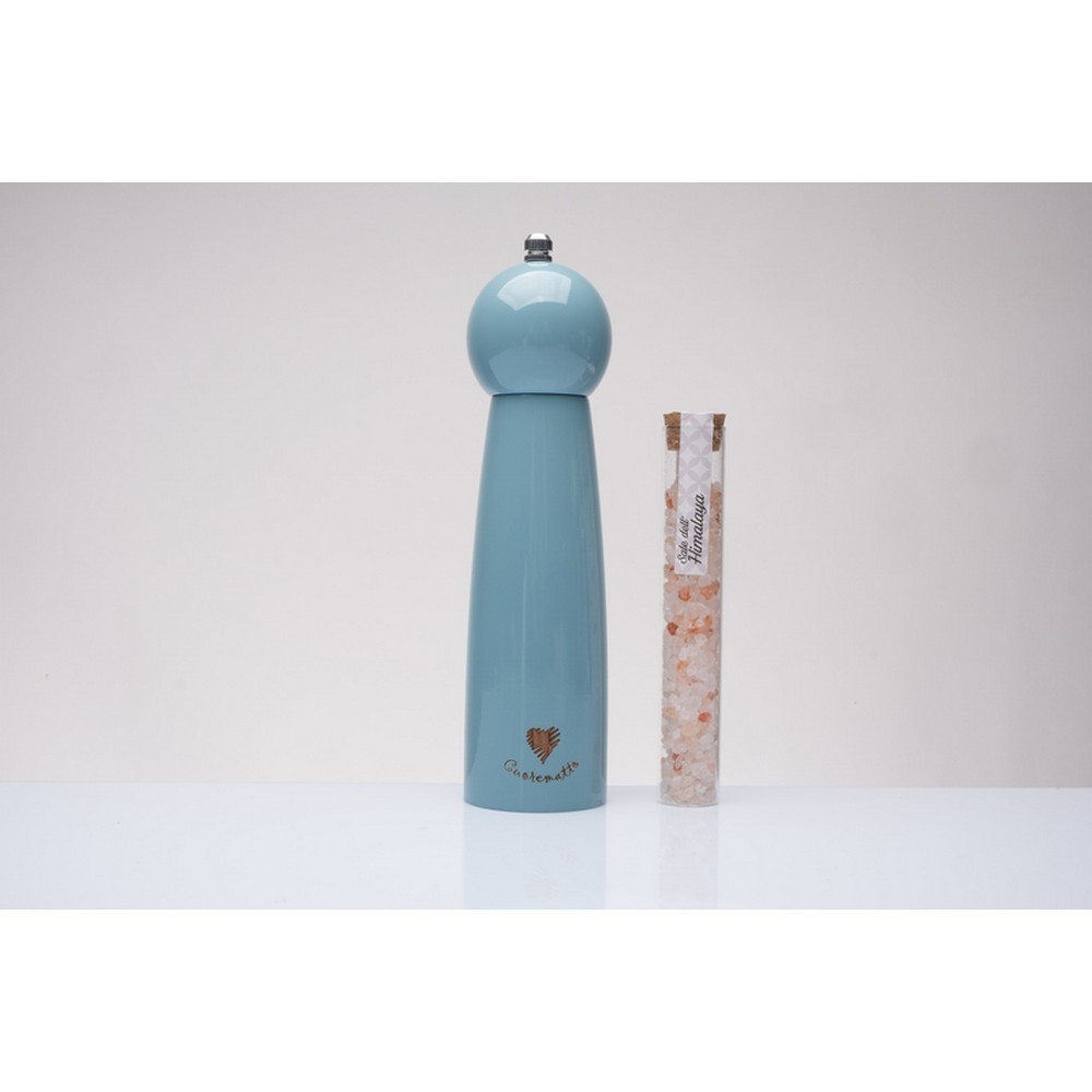 Nuovo macinasale in legno verniciato di colore ottanio di Cuorematto accompagnato da scatola regalo e sale assortito ( sale rosa dell'Himalaya, sale di Camargue o sale bianco di cipro ).