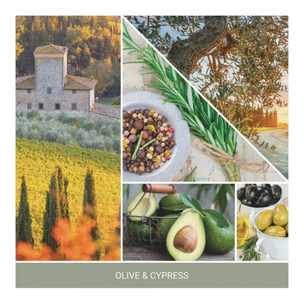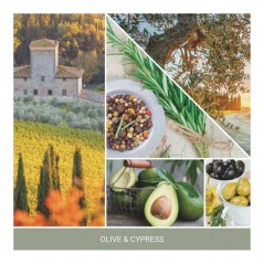 Candela grande Yankee Candle Olive & Cypress,è una fragranza Dolce e Speziata,Perdetevi nella meravigliosa natura toscana, con note che evocano il profumo degli ulivi, del rosmarino e dei cipressi.Questa è la più grande candela nella gamma realizzata con due stoppini e un mix di altissima qualità di cera di soia il quale fornisce una stupenda fragranza a lunga durata e una meravigliosa atmosfera.